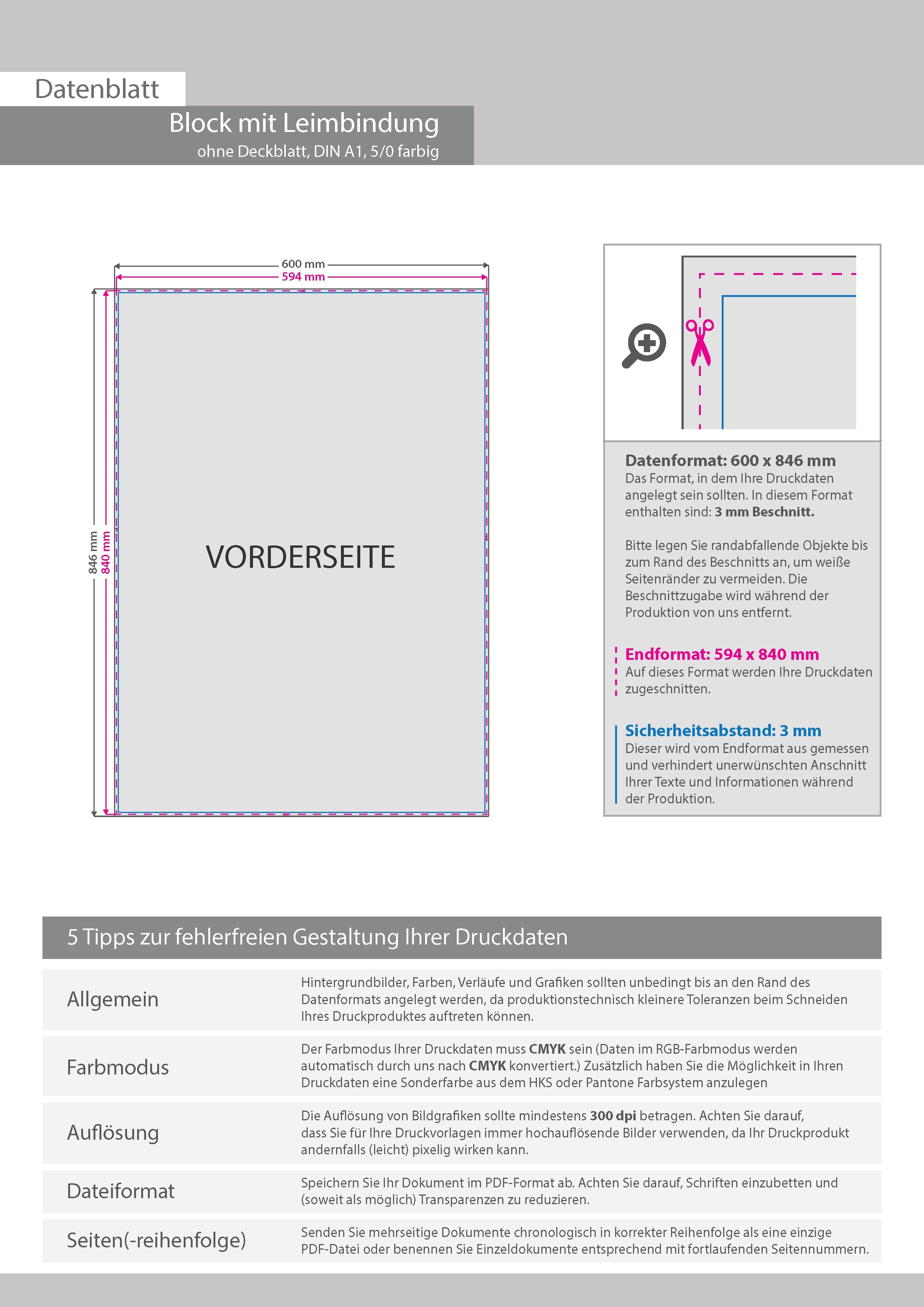 Block mit Leimbindung, DIN A1, 10 Blatt, 5/0 farbig einseitig bedruckt (CMYK 4-farbig + 1 Sonderfarbe HKS oder Pantone)
